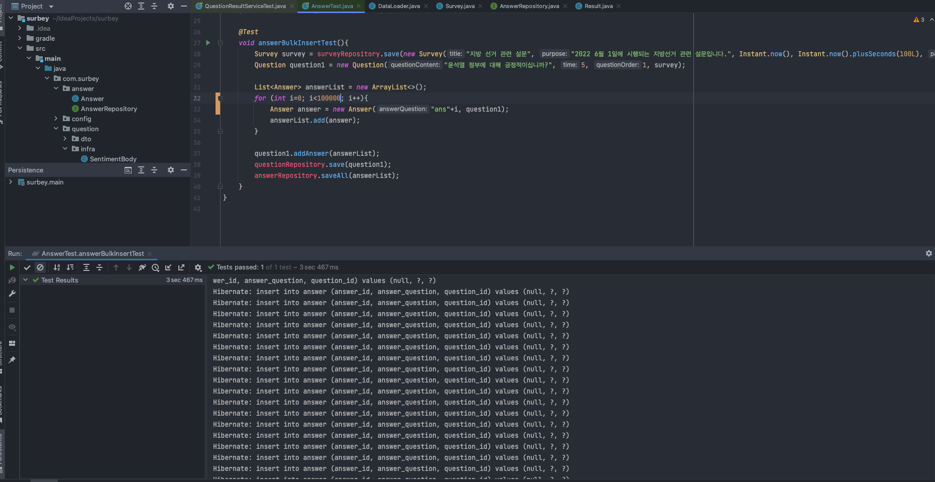 JdbcTemplate을 이용해 batchUpdate를 통해 batchsize를 100으로 설정하고 Answer 도메인에 대한 query를 날리는 코드는 다음과 같이 구현할 수 있다. .