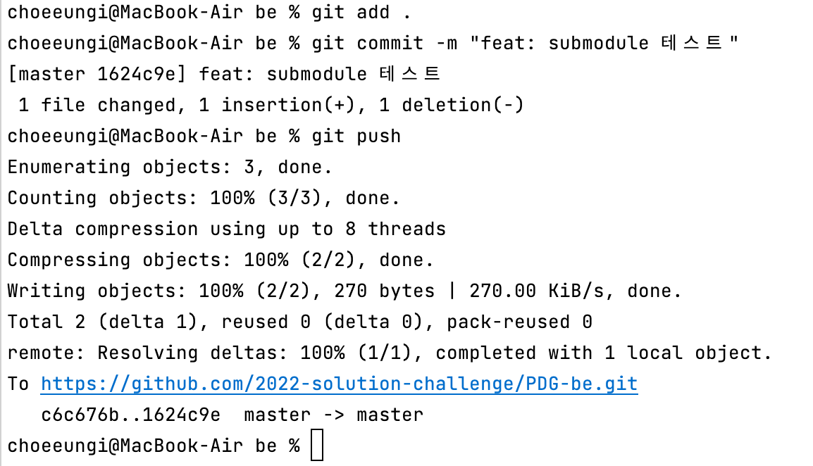 git submodule 방식은 branch의 hash를 작성하는 방식이다. 그렇기 때문에 git submodule update --remote 을 진행하면 submodule의 내용이 update 된다. 본 프로젝트에는 hash가 변경 된다. 이후 반드시 본 프로젝트의 git commit을 진행해야 hash가 제대로 업데이트 된다. 다시 말해, git commit -am "message" 를 진행하고 Push를 해야 한다!