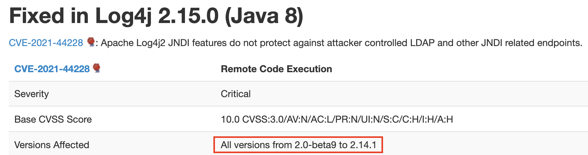 log4j 2.14.1 버전은 CVE-2021-44228 에서 나와있듯, 보안취약점에 영향을 받는 버전이다. 다음 사진에서 나와있듯, 2.15.0 버전으로 변경해야 한다.